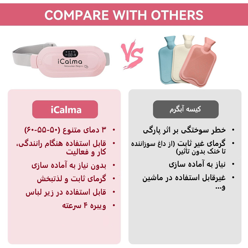 کمربند حرارتی iCalma با سه حالت دمایی 50، 55 و 60 درجه سانتی گراد، گرمای یکنواخت و بسیار مطبوعی را برای شما ایجاد میکند. برخلاف کیسه آبگرم که دمای آن از حالت جوش به سرد همواره در حال تغییر است. کمربند iCalma به راحتی در دسترس است و سریع گرم میشود. نیاز به جوش آوردن آب و آمادگی خاصی نیست. همچنین خطرات سوختگی بر اثر آب جوش را ندارد. دارای کش پَهن و قابل تنظیم است که به شما اجازه میدهد در هر حالتی قابل استفاده باشد! برخلاف کیسه آبگرم که فقط هنگام استراحت قابل استفاده است و اجازه تحرک نمیدهد. در زمستان بعنوان گرم کن شکم و پهلوها نیز قابل استفاده است. علاوه بر گرم کردن شکم، برای کمر نیز مناسب است. باتری 1800 میلی آمپری این کمربند با 2 الی 3 ساعت شارژ، فول شارژ میشود و برای استفاده به مدت حدودا 1.5 ساعت با بیشترین درجه حرارت کافی ست. شارژ توسط کابل type-C انجام میشود که در بسته بندی نیز وجود دارد. پشت این کمربند گرم کننده، از پارچه مخملی super-soft استفاده شده که بسیار لطیف است و حس خوبی را هنگام تماس با بدن منتقل کند